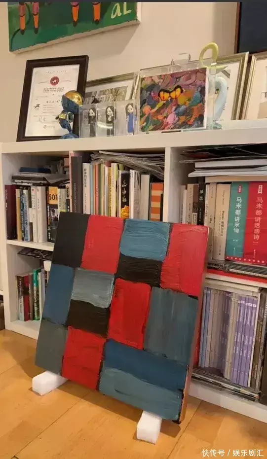细细看,朱珠将新购买的画作放在书框前边拍摄。背后放着好多的书箱,相架还有些画作。固然看去有少许点乱,但也不是前俯后合,而是“乱中有序”。