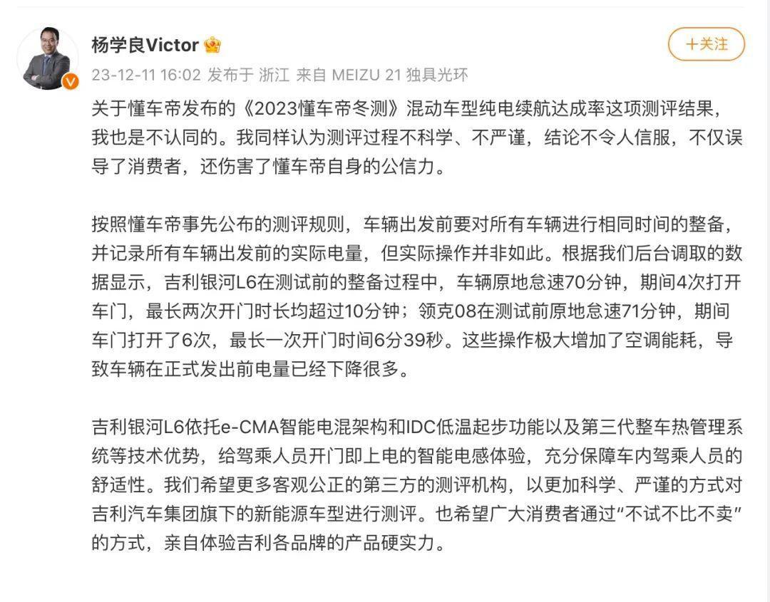 关于懂车帝冬测,祥瑞集团高等副总裁@杨学良Victor 在11日下昼发微博,以为“测评经过不科学、不严谨,论断不令东说念主肯定”,不仅误导了消费者,还伤害了懂车帝本身的公信力。