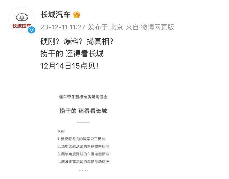 澳门新浪体育彩票12月11日午间,长城汽车也在官博文牍,将于12月14日15时在北京举行懂车帝冬测圭臬质疑疏导会,议题包括:新动力冬测的科学公说念圭臬、纯电续航测试的车辆整备圭臬、爬坡角度测试的车辆电量圭臬、爬坡距离测试的车辆制动圭臬等。