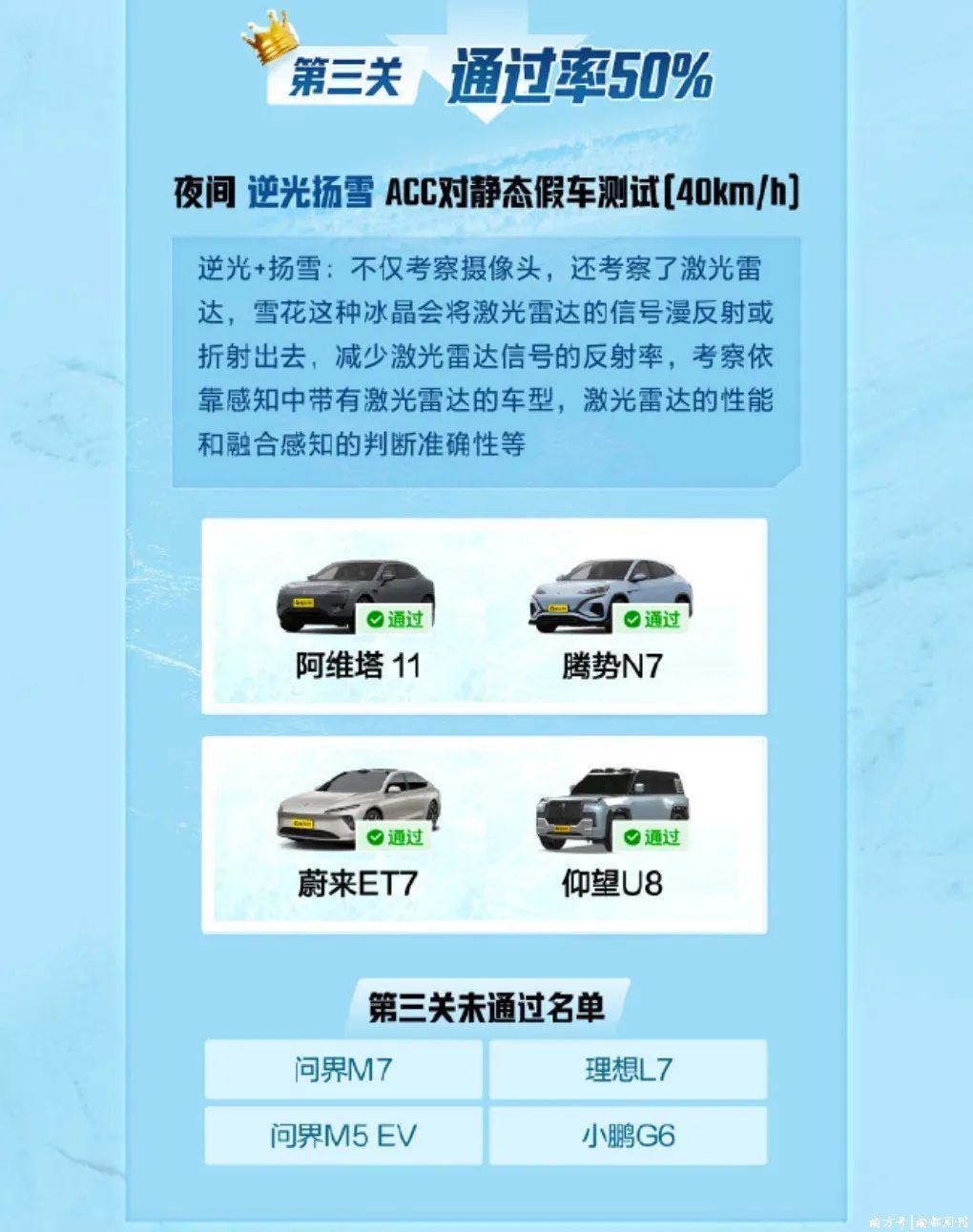 此外,在《2023懂车帝冬测》的测评中,在华为引以为傲的援救驾驶方面,问界M5 EV、问界M7通过了夜间逆光ACC(自稳当巡航罢休系统)实测,但未能通过逆光扬雪40/h以及逆光扬雪60/h测试。